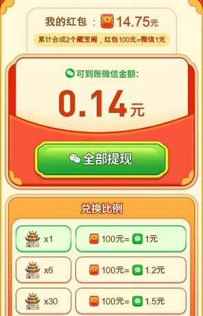 1、刚开始的兑换比例为1%,要是合成了6个藏宝阁,其比例就能提升到1.2%,这样到账的红包更多。