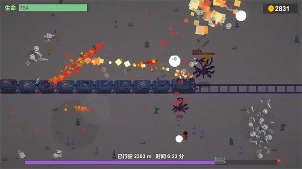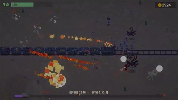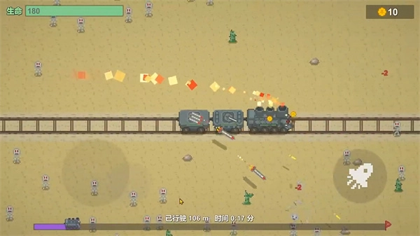 击败怪物仅能获得金币,无法获取经验。界面下方设有进度条,唯有火车抵达终点时,方可进行属性选择——既可以提升护甲与血量,也能够增加额外的攻击车厢等。在持续前进的过程中,会途经商店,此时就能用击败怪物所得的金币购买物品,这些物品的效果与三选一的选择机制类似。敌人会从各个方向发起攻击,玩家必须阻止敌人接触车厢,一旦被碰到,就会因受到伤害而扣血。每个车厢都有独立的血量,即便车厢受损也无妨,最坏的情况不过是被击毁;但车头则不同,一旦车头损毁,整个游戏便会结束。