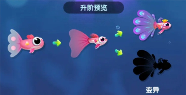1、游戏中的小鱼从成长期到皇冠期,每次升级时都有概率发生变异;若小鱼存在多种变异形态,将随机变异为其中一种。