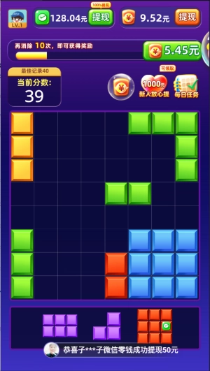 鸿运消砖块是一款玩法类似俄罗斯方块的红包消除小游戏。在游戏里,你要把各种不同形状的方块填进格子中,只要凑满一行或者一列就能消除并得到红包奖励。要是完成了一定次数的消除,还能获得额外红包呢!这款游戏玩法十分简单,福利也不少,心动的话就快来体验吧!