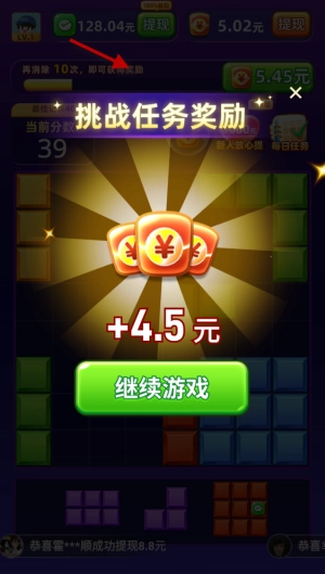 2、每一次消除都能得到一定的积分和红包,连消或者同时消除多行,能够得到更高的积分和更多的红包!