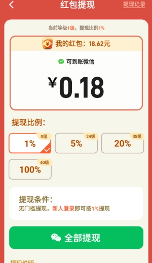 4、积累的所有红包都可以按照一定比例提现,并且比例可以通过升级来提升。