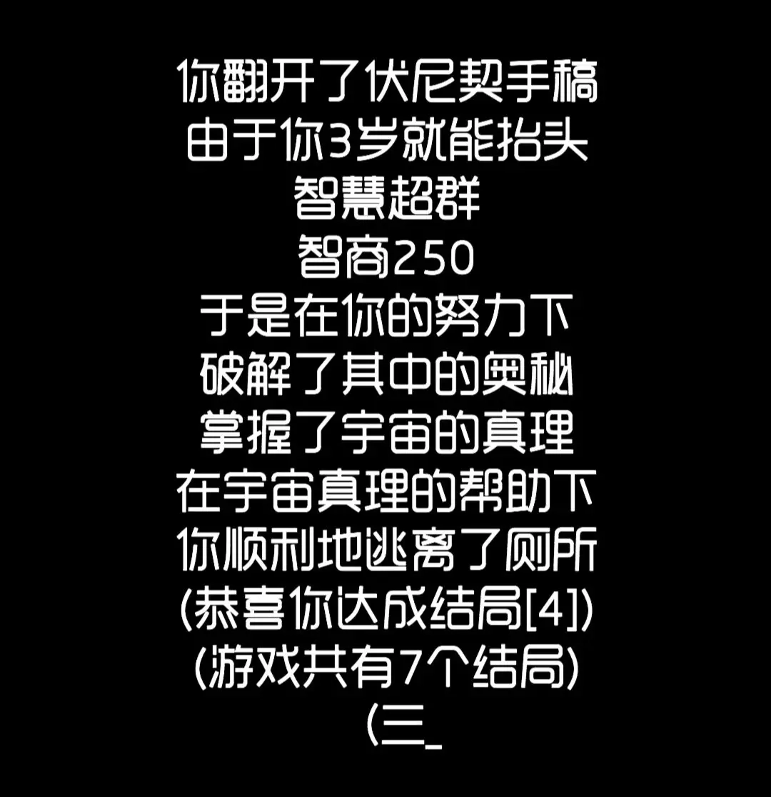 跑到终点就是这个手机和马桶,以防万一别忘了踩一下手机屏幕,想要回去的话碰一下马桶听到冲水声就ok了,到结局墙看一下就可以看到第十六个结局“新世界”啦~