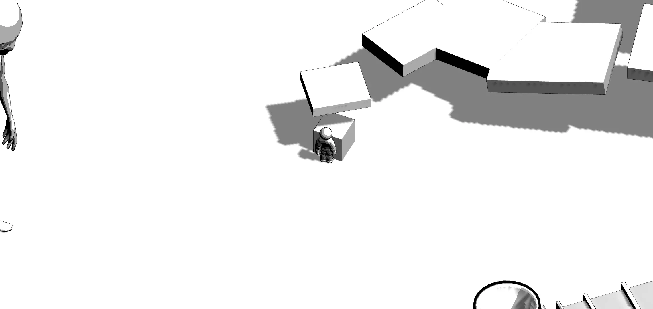 然后就会进入图下这个地方,空中会掉下来一个方块,把那个方块推到这个板子前面当垫脚石,跳上去开始跑酷
