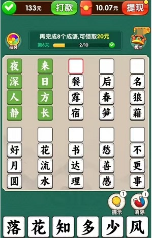 3、随时可以使用提示功能,这样就能让玩家直接知晓答案,同时也能使用消除功能,可以直接让成语自动填好。