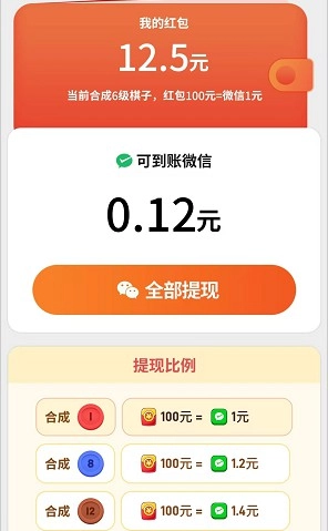 2、一开始的兑换比例为1%,合成数字8,比例到1.2%,合成数字12,比例到1.4%,比例越高,到账越多。