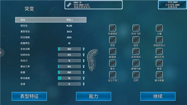 4、通过点击顶部的DNA图标,能够自由配置细菌的属性,定制专属力量。