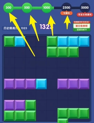 2、通过将方块凑齐整行或者整列即可消除获得分数,达成系统设置的分数标准之后即可获得丰富的奖励。