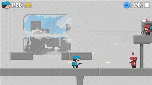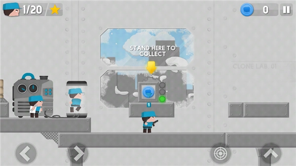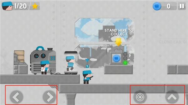 4、博士会复制克隆自己的小兵,玩家可以控制,左边控制小兵的方向,右边控制射击和上跳;
