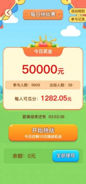 2、每日挑战赛活动,按照我看游戏今日的挑战奖金有50000,每人可瓜分85,目前已经有500多人达标,每天有10次挑战机会,其实这个奖金是不会超过10,超出部分只会按照10计算,所以大家游戏技术好的可以挑战一下,如果成功通关那么即可赚到10米。