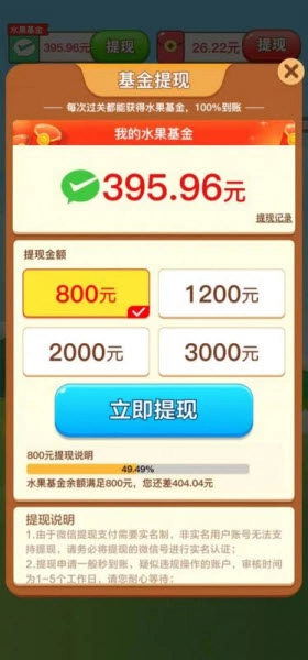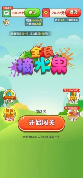 在全民摘水果这款游戏里,玩家需要做的就是把场景中的水果全部消除干净,相同的水果可以直接消除,玩法规则很简单,而且只需要用手指点击屏幕就能完成一系列操作。玩家可以通过消除水果、观看广告等途径免费领取红包,这些红包是真实且可以提现的,只要满0.3元就能直接申请提现。