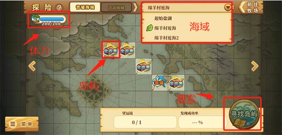 1、截图左上角显示的是探险点,每次开展探险活动需要消耗15点探险点,一旦探险点被消耗完,就不能再进行探险,得等探险点恢复之后才能重新开启探险。右上角标注的是探险海域,能让各位村长更快捷地切换不同海域去探索,每个海域所产出的材料都存在差异。在海域里进行探索需要用到航海图,借助航海图能够找到还没被发现的岛屿,当成功发现岛屿后,就可以前往该岛屿展开探索啦~