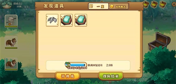 7、当所有区域探索完毕后,本次探险便宣告结束,各位村长可选择再次挑战或者探险结束,结束本次探险。探险玩法在绵羊村中是非常重要的玩法,完成任务或者加工道具时,均有使用到无人岛屿出产的材料。本次探险详解,想必各位村长对探险玩法应该有了一个比较深刻的了解,那么祝大家在绵羊村玩的开心鸭~