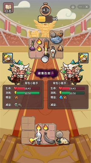 1、背包里可以放入各种各样的物品来战斗,不同的物品可以合成来获得新的装备。