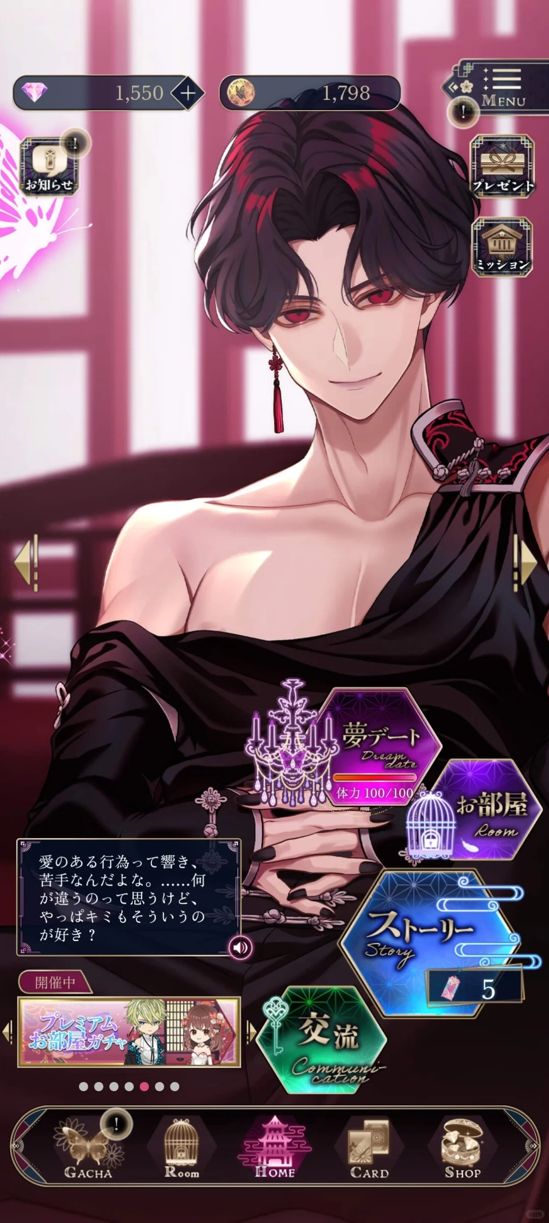 1、home:右上礼物和任务;右下是梦约会、房间(同room)、剧情、交流
