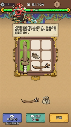 3、相同的装备可以合成升级。钱袋会使看官在每波敌人过后,额外获得一定数量的银币。