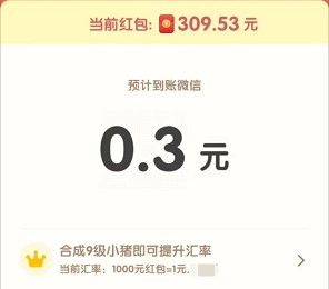 只要不断合成小猪,就能领取不错的红包,满0.3元就能提现,到账绝对没问题。