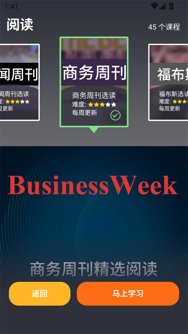 2、阅读板块设有45种读物,每种读物均标注了难度和单元数,像“每天读一点英文”这类,便于学习者挑选契合自身水平的内容。