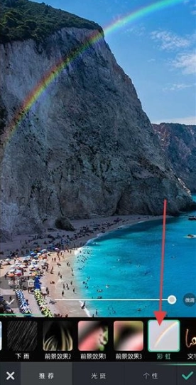 2. 在底部找到特效栏,其中有光斑等推荐分类,从中选中彩虹等特效,接着对参数进行调整,以此为照片增添相应的特效元素,让画面的视觉效果更加丰富。