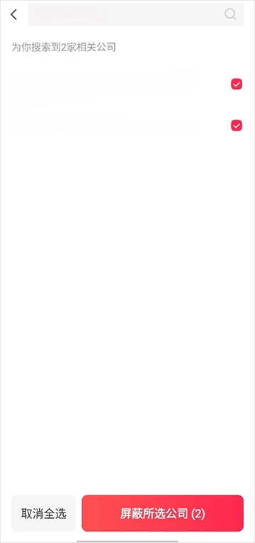 5、最后输入公司名称,于搜索结果里选中目标公司,点击“屏蔽所选公司”就可以了。