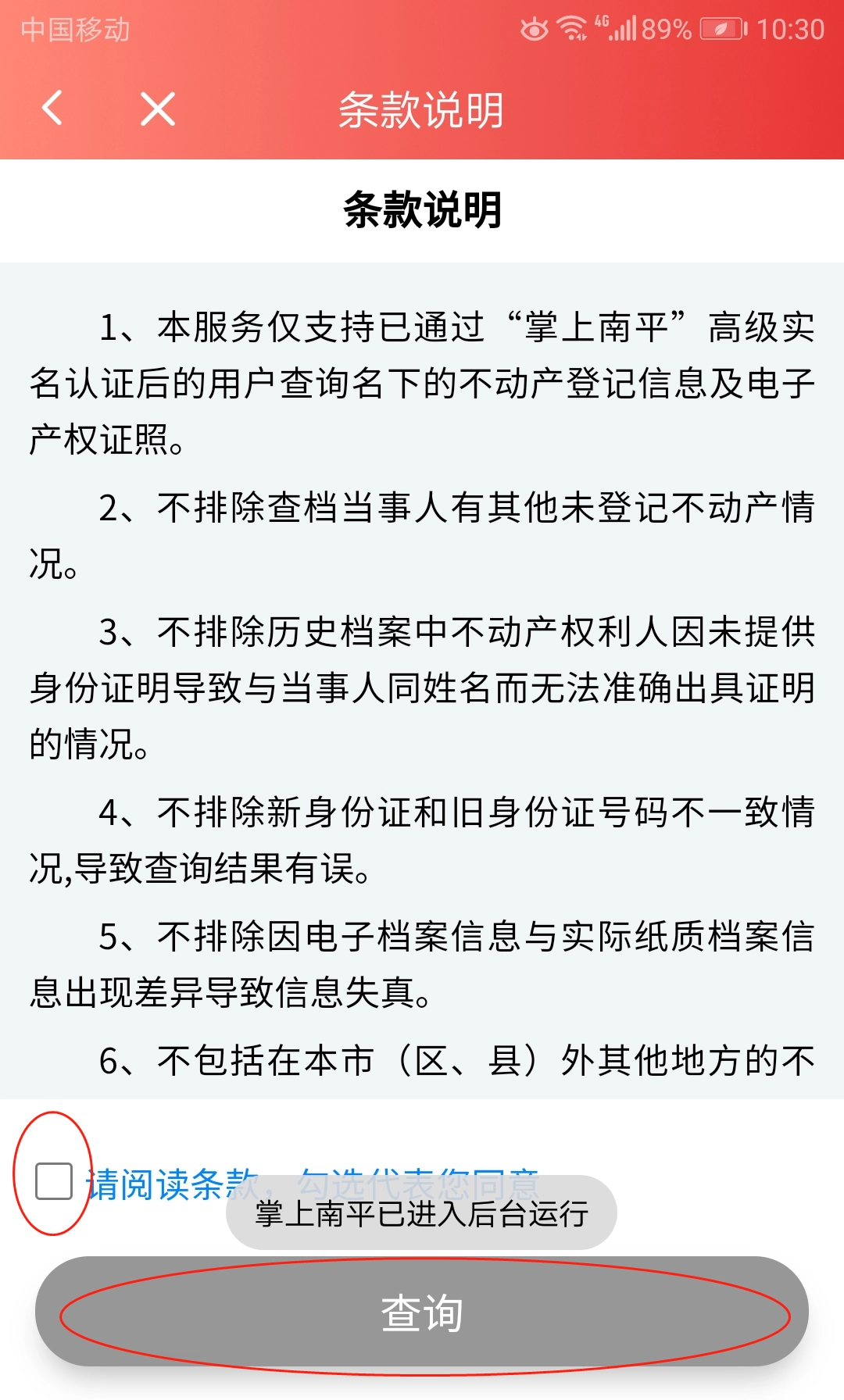 第三步:仔细研读“条款说明”内容,勾选“请阅读条款,勾选代表您同意”,然后点击“查询”