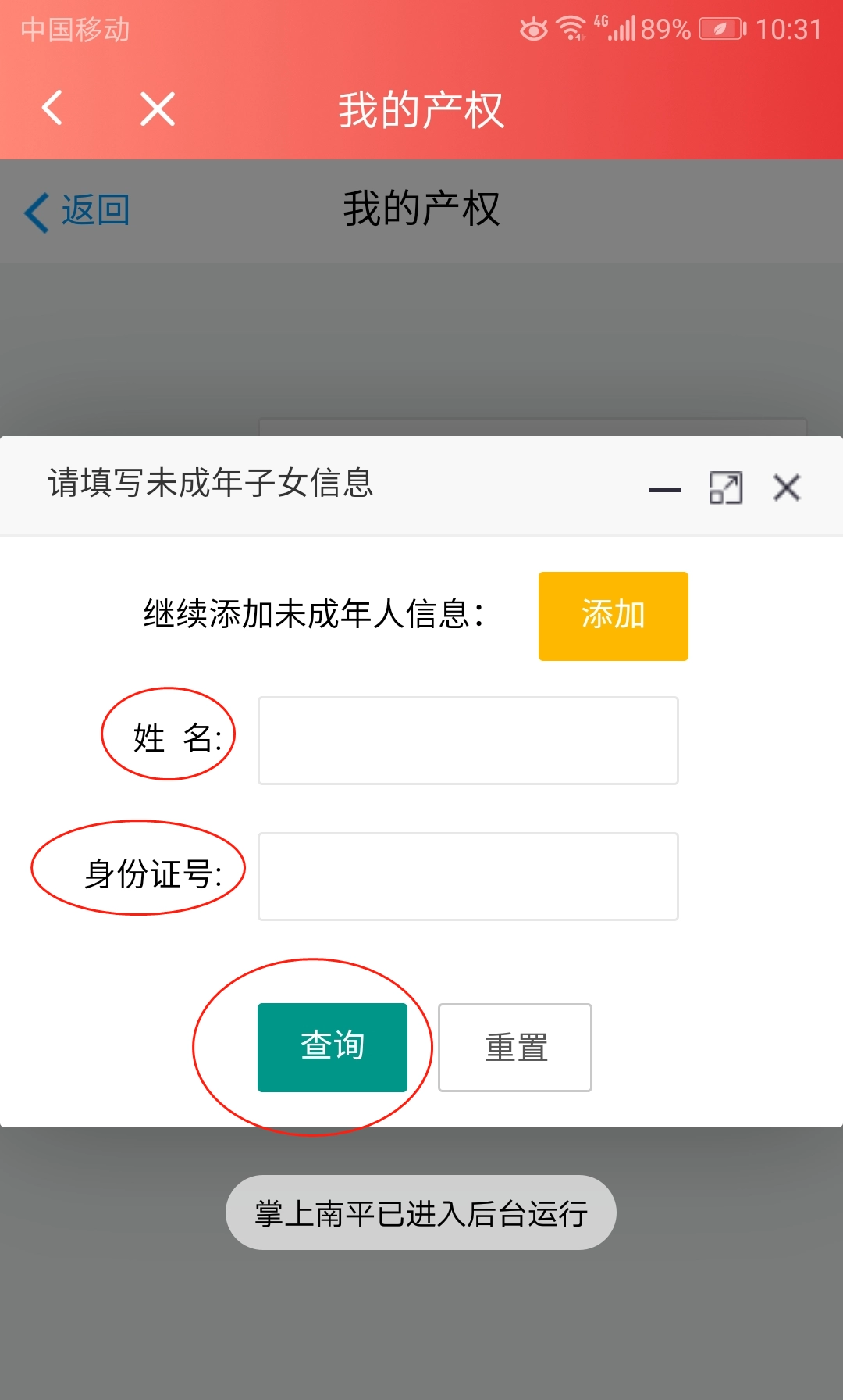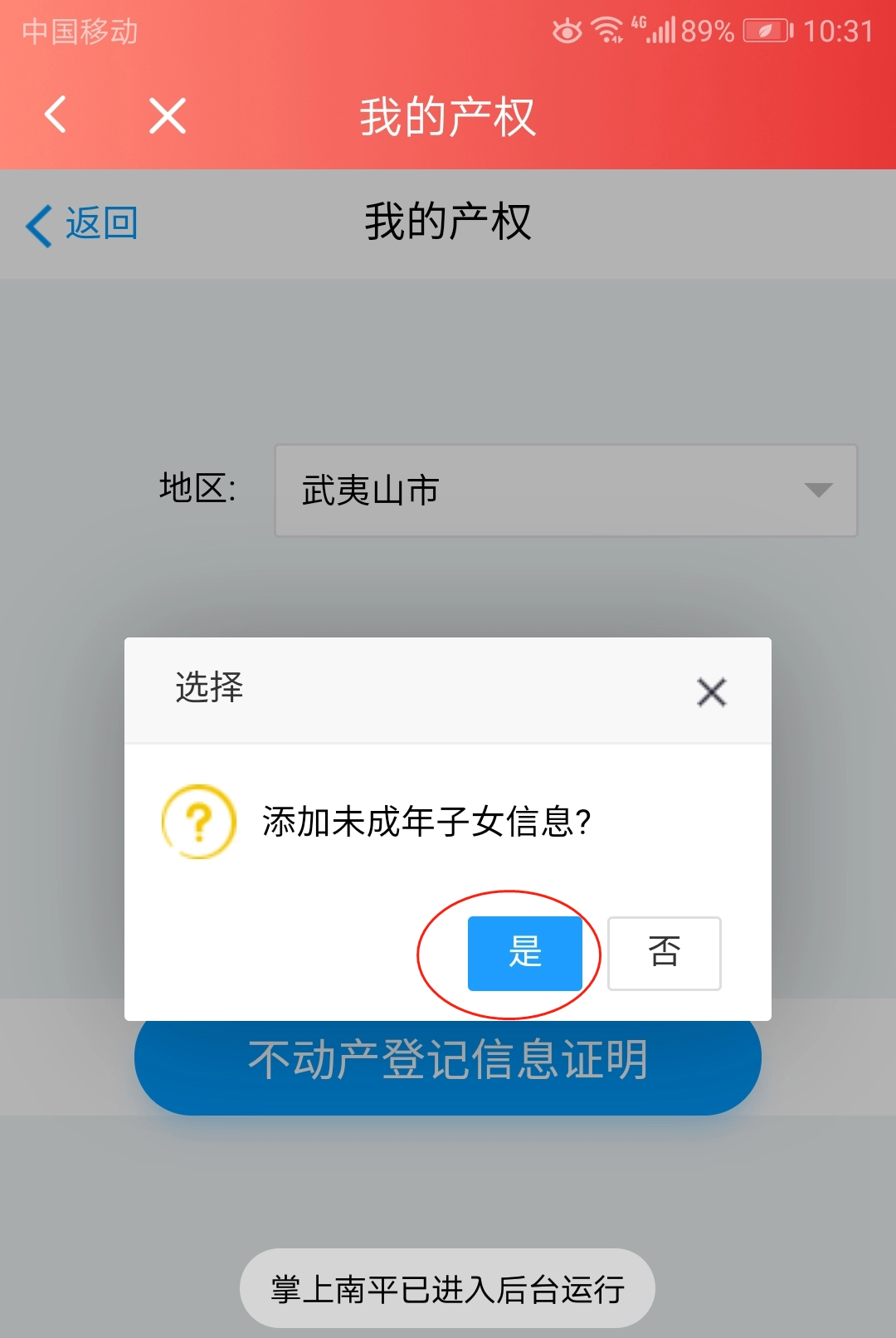 第四步:选取你想要查询的地区“武夷山市”,接着选择“不动产登记信息证明” 。若根据提示,你需要查询未成年子女的相关信息,就选择“是”,并输入子女的相应信息,最后点击“查询”。