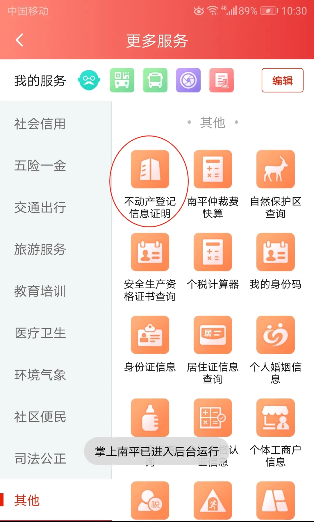 第二步:点击“掌上南平”,再点击“更多”。在更多服务界面向下滑动,找到“其他”,接着点击“不动产登记信息证明”,然后点击“我的产权”。(注:若用户尚未注册账户,需先完成注册,注册成功后点击“首页”。)