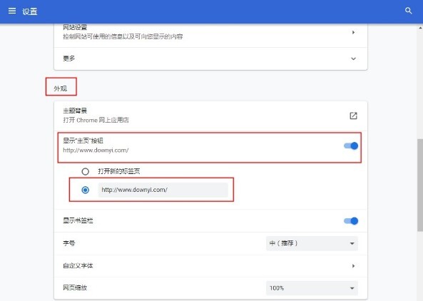 3. 在设置选项中找到外观选项,勾选显示主页按钮,然后输入你想要设置为主页的网址。