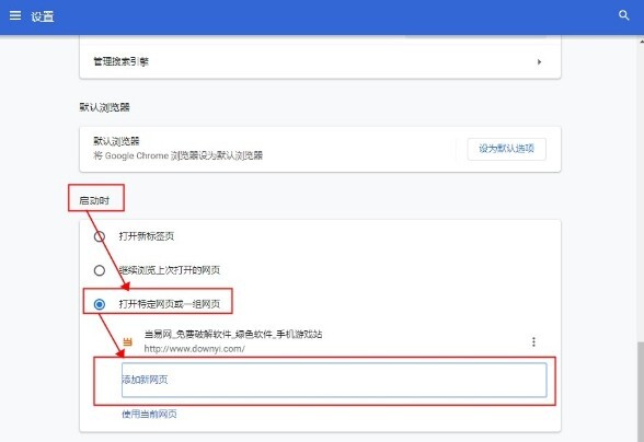 4. 接着设置启动时网页的打开方式,具体可参照图示。按照个人喜好的网站进行相应设置,如此一来,当你启动谷歌浏览器时,呈现的便是自己所需的主页。