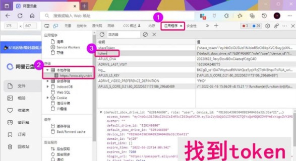 3. 登录成功后,按下键盘上的F12键(也可以按ctrl + shift +i ),打开“开发人员工具”。接着,按顺序点开:应用程序(Application)→本体存储(Local Storage)→token。点开token后,在下方找到reflash_token,其后面的那串代码,即为token值。
