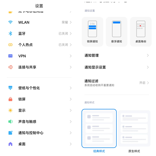 1.进入【通知与控制中心】-【通知显示设置】,切换为原生样式,方便后续操作