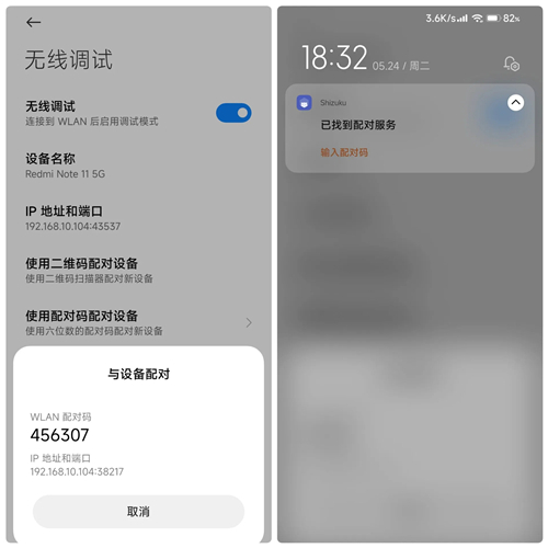 4.会显示配对成功,返回Shizuku选无线调试中的启动,成功后主页会显示Shizuku正在运行