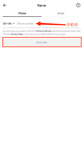 4、输入手机号码或者邮箱号,点击“Send code”注册。