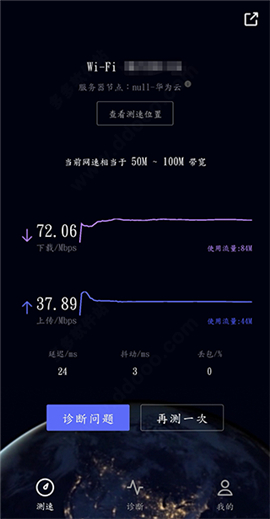 1. 界面简洁清爽,没有任何广告,背景设计为动态变化的地球,使得测速过程更具“黑科技”感。
