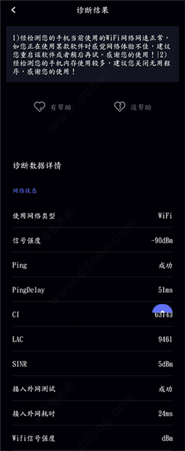 4、若遇到突然无法上网或网络状况不佳的情况,在一键测速App中点击“诊断”,并选择对应的问题场景。随后经检测,就能对信号强度、Ping、LAC、SINR、外网测试等进行诊断,是否存在问题清晰可见。