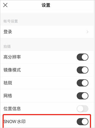 4、进入设置页面后,找到“SNOW水印”。