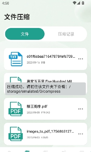6、随后会弹出“压缩闯关”的弹窗提示,并展示文件路径详情,这表明压缩已顺利完成。