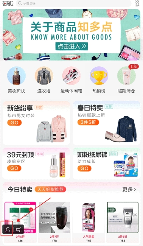 3、涵盖服装、美妆、家居等各个类别的产品。韩束、森马、阿依莲等超过500个品牌进驻,保证100%的正品。