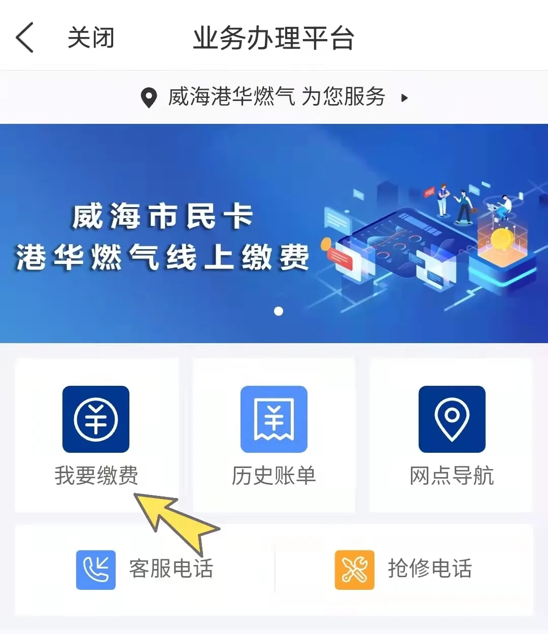 3.点击“燃气缴费”——选择燃气公司(以威海港华燃气为例)——点击“我要缴费”