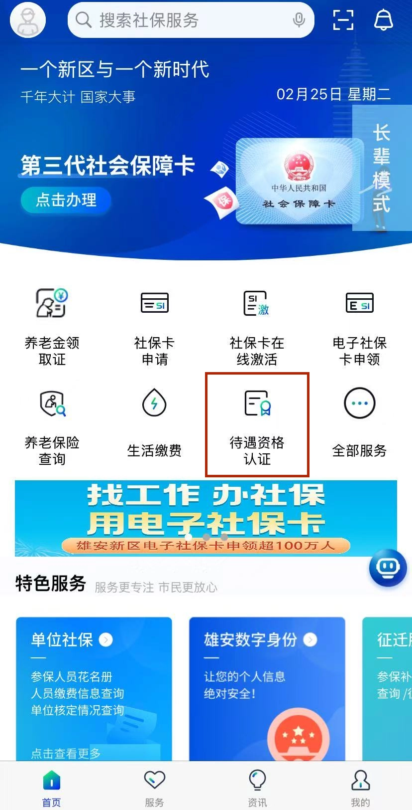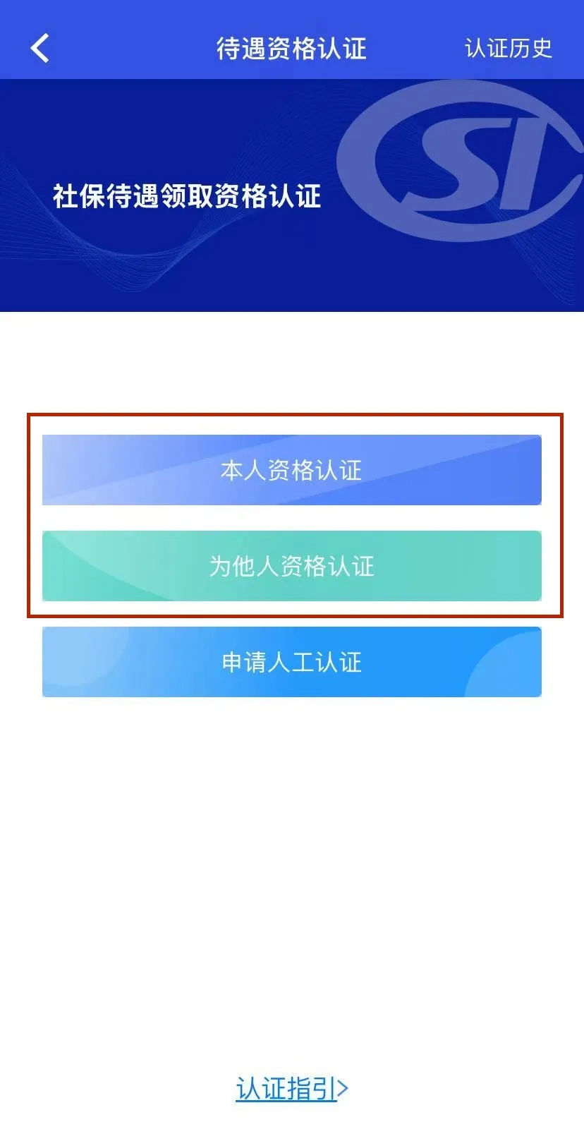 第二步:点击首页“待遇资格认证”。选择“本人资格认证”或“为他人资格认证”。