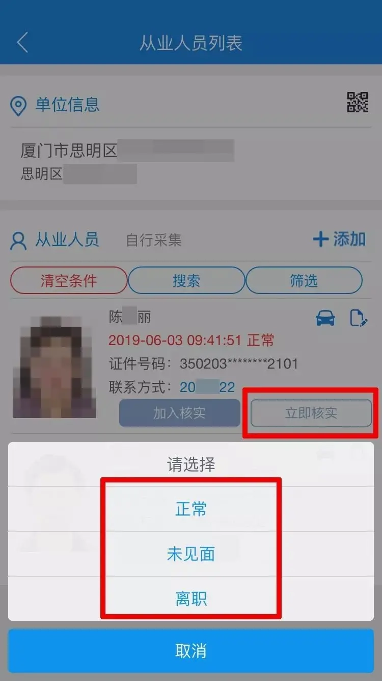 进入从业人员列表:根据现有员工情况操作,点击【立即核实】,如员工在岗就点击正常,如该员工辞职了就点离职。全部核实一遍,返回上一页重新再进入,操作核实过的员工时间和数据才会更新。