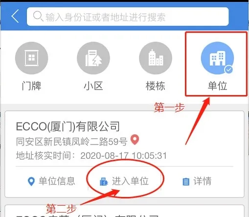 点击【单位】,不用输入公司的名称就会显示出来。如果没跳出来,多点几次试试,如果还是无法显示,请主动联系社区民警或辅警分配权限地址。