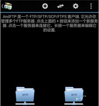 1.打开AndFTP,界面是这样的,接下来点击上面的加号+,添加你的域名,类型(我用的是sftp),账号,密码,(其他先不改),点击高级