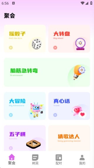1、聚会页面设置了摇骰子、大转盘、脑筋急转弯、大冒险、真心话、五子棋、猜歌达人等多种玩法。