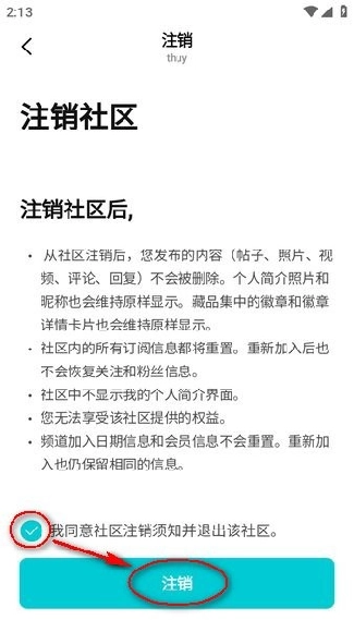 5. 在弹出的选项当中选择“注销”,并且勾选“我同意社区注销须知并退出该社区”这一选项。