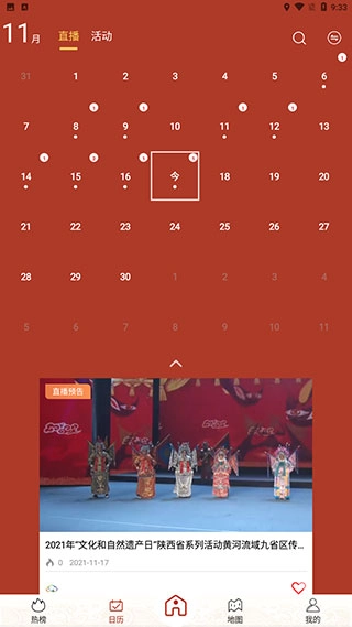 2、然后是软件的日历页,这里显示的是全国的各个文化馆的直播活动的日程表,我们不仅可以查看以前的历史直播记录,也可以看到未来一段时间内的直播预告,方便我们对活动时间做出及时的安排。