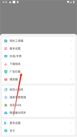 2、进入设置后,找到并点击“广告拦截”功能;