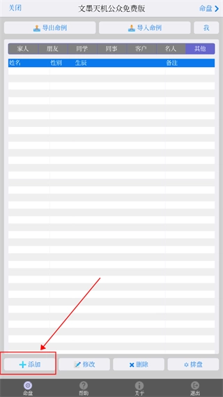 初次使用文墨天机App的用户,往往依据以往使用其它App的操作习惯,每次排盘都先在“命例”页面里点击“添加”按钮(如下图所示)。这样虽然可以排盘,但是操作上略显复杂,需要反复切换页面。其实,有更简单的操作方法。