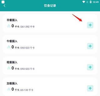 2、在饮食记录页面中,选择想要记录的饮食类别,这里以早餐为例,点击早餐栏位右侧的“+”图标。