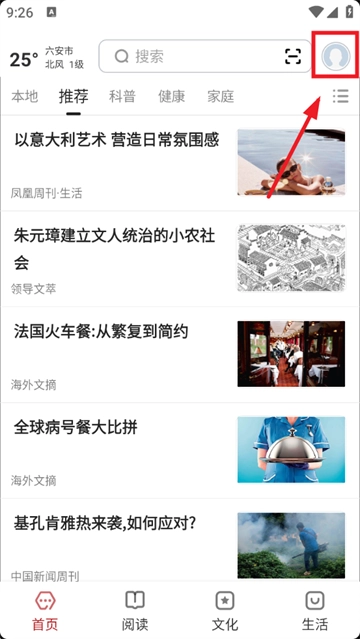 1、首先打开数字六安,接着点击右上角头像;